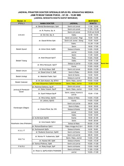 Mengetahui jadwal dokter BPJS Krakatau Medika adalah langkah penting untuk mendapatkan pelayanan kesehatan yang optimal. Dengan informasi yang tepat, kamu bisa merencanakan kunjungan dengan lebih baik, menghindari antrian panjang, dan memastikan kamu mendapatkan penanganan medis yang tepat waktu. Manfaatkan berbagai sumber informasi yang tersedia, seperti website resmi, aplikasi mobile (jika ada), dan telepon langsung ke rumah sakit, untuk mendapatkan jadwal yang paling akurat dan up-to-date.
